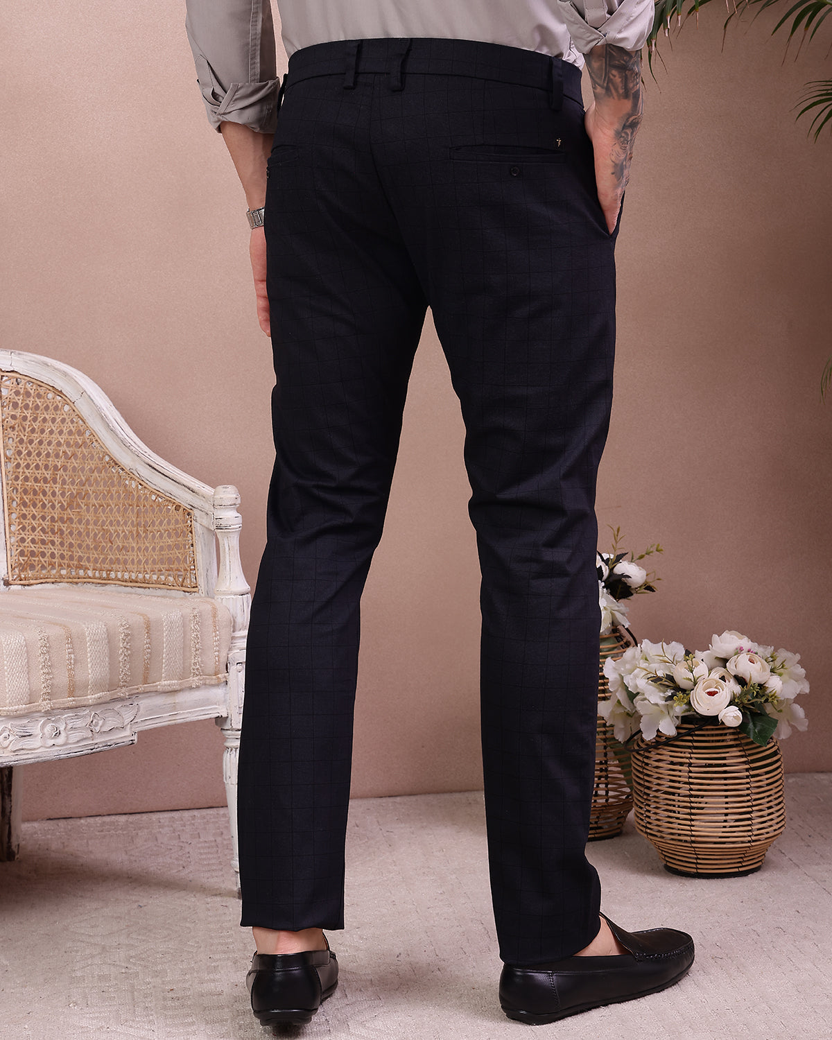 Make an impression in the versatile Checkmate navy cotton trousers. With their eye-catching checkered pattern, these trousers add polished style to any outfit. The tailored fit and tapered leg create a polished silhouette, while the slight stretch cotton moves with you for all-day comfort. Pair them with a button-down for a refined office look or dress them up with a blazer for an evening out. The checkered pattern adds visual interest that makes you stand out.Material
