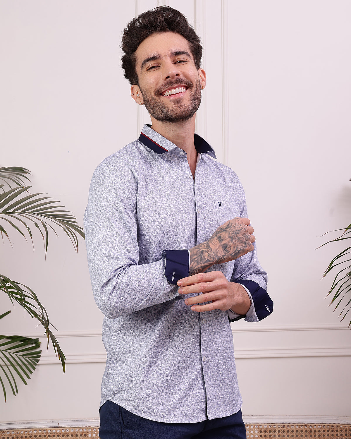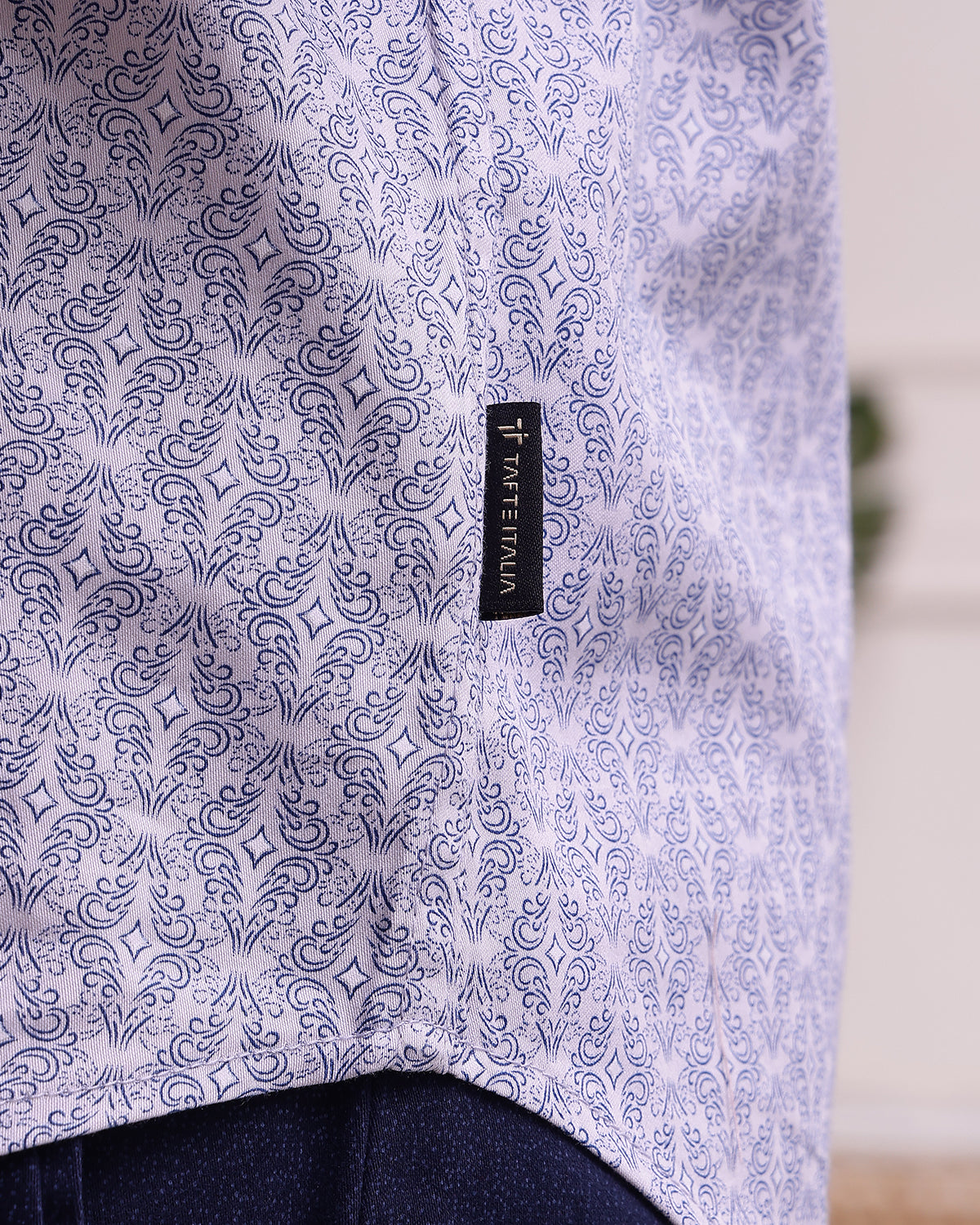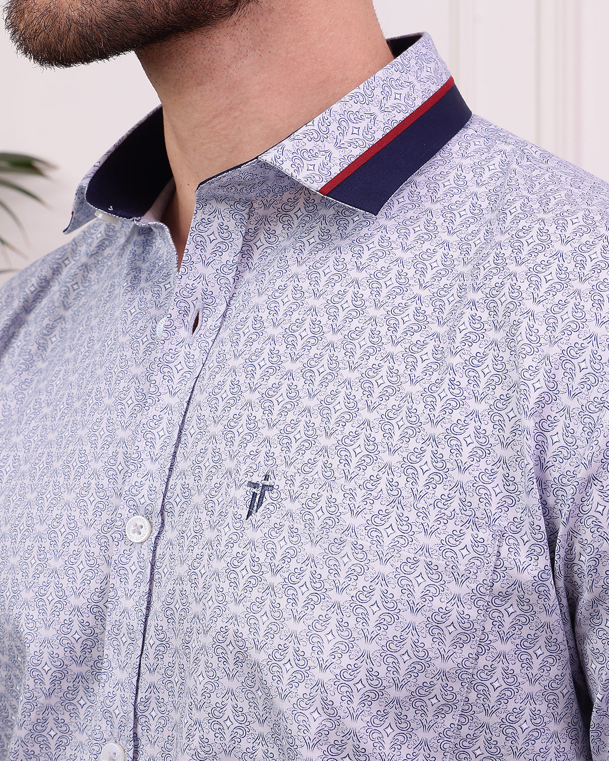 Stand out from the crowd in the bold, eye-catching coral blue Tafte Italia shirt. This stylish printed party wear takes your look to the next level with its mix-matched patterns on the cuffs and collar that add a touch of flair. Make a statement whenever you walk into the room. The vibrant coral blue grabs attention while the fun details on the cuffs and collar give your outfit personality. Look and feel your best as you dance, mingle and celebrate the night away.Material