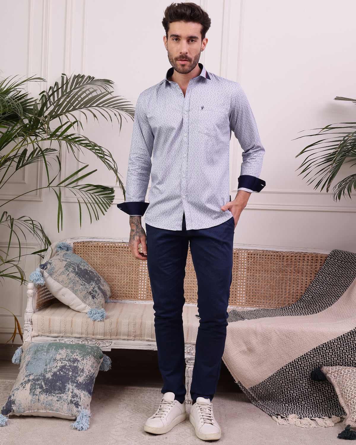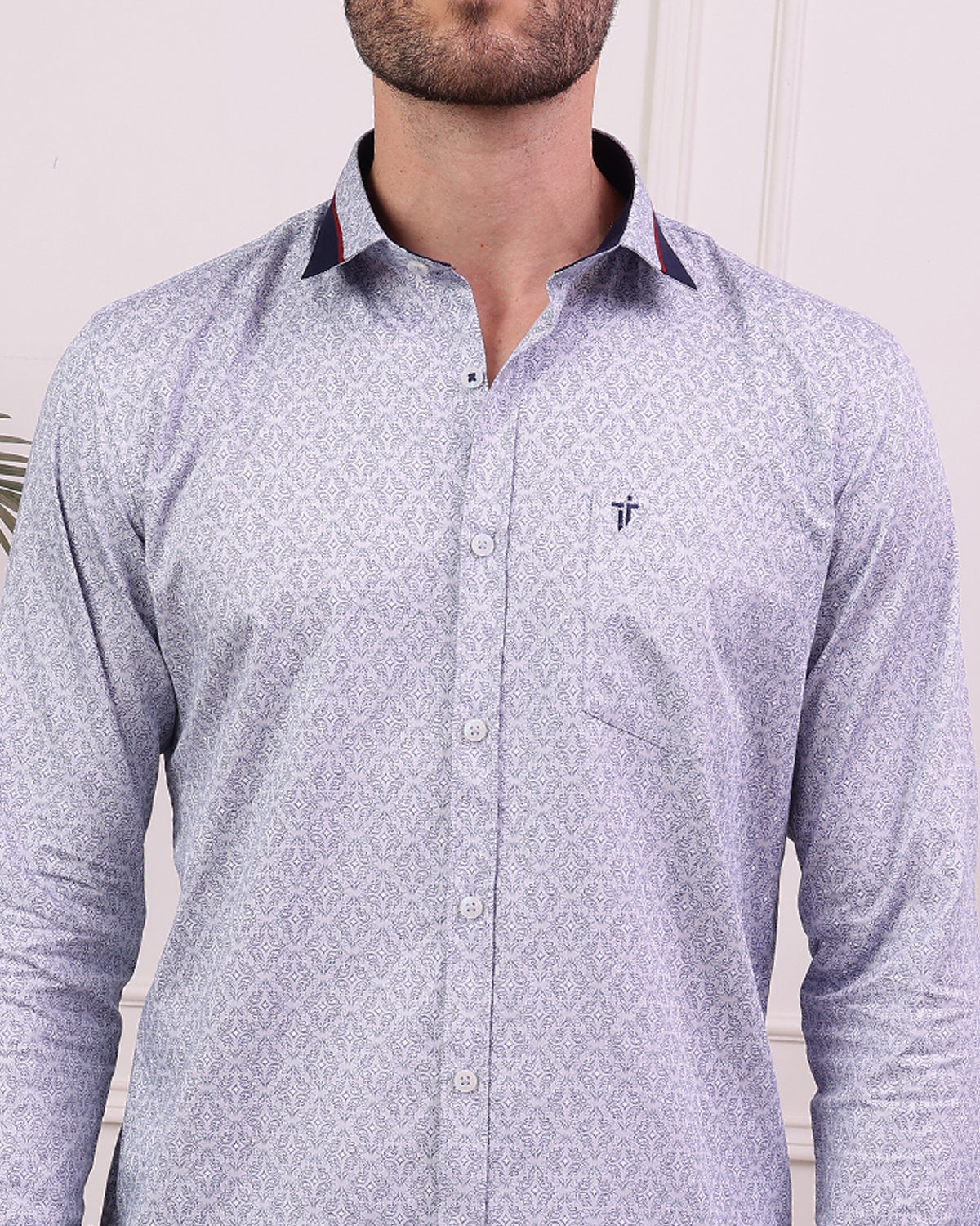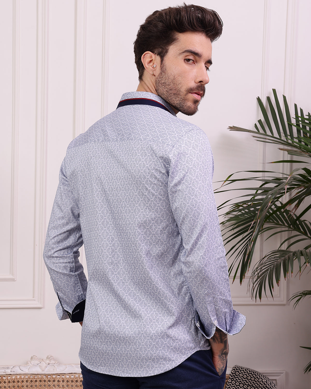 Stand out from the crowd in the bold, eye-catching coral blue Tafte Italia shirt. This stylish printed party wear takes your look to the next level with its mix-matched patterns on the cuffs and collar that add a touch of flair. Make a statement whenever you walk into the room. The vibrant coral blue grabs attention while the fun details on the cuffs and collar give your outfit personality. Look and feel your best as you dance, mingle and celebrate the night away.Material