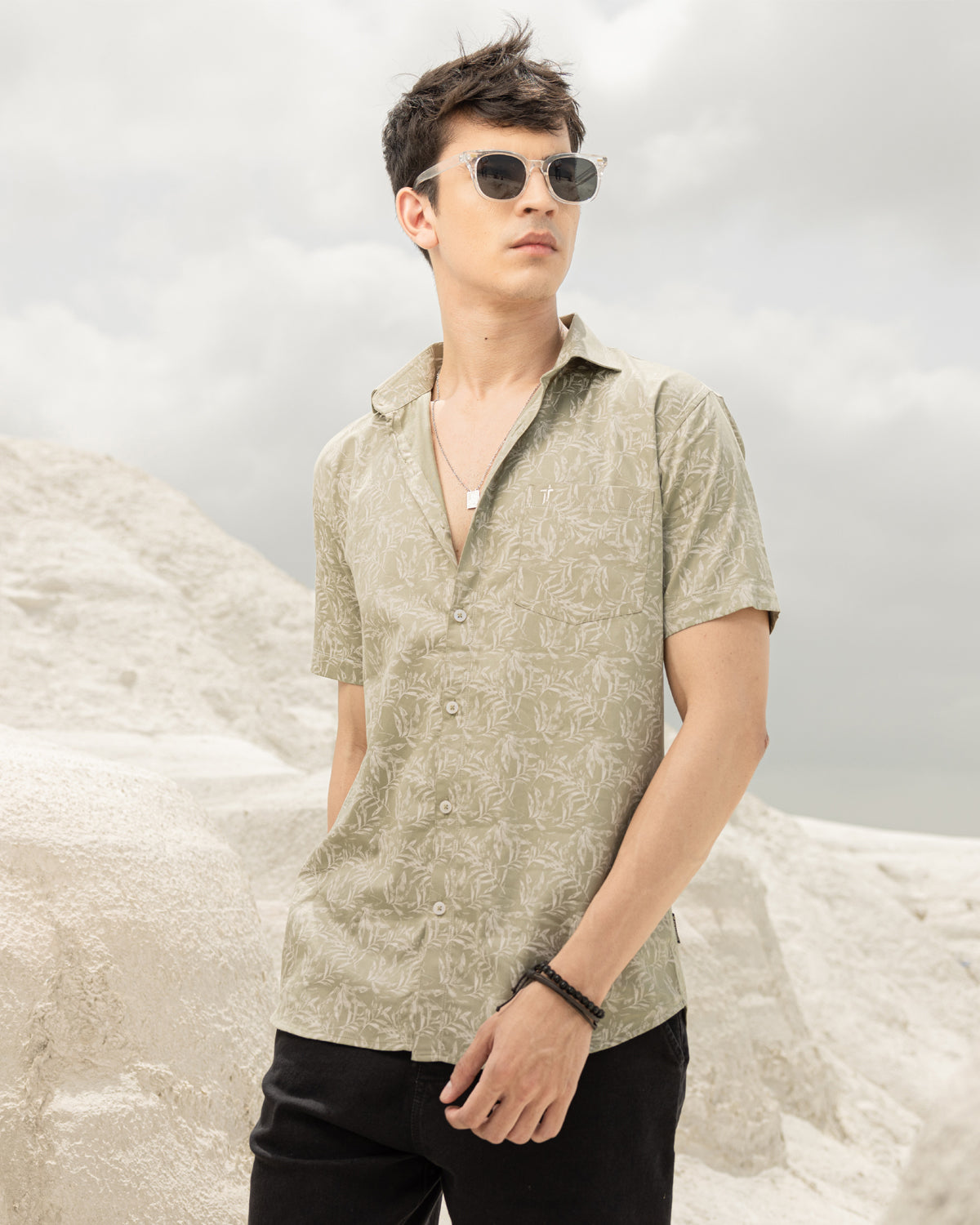 Escape to paradise in our 'Fern Green' shirt, digitally printed with crisp white leaves for a stylish getaway look. Crafted from fine cotton for comfort, it's perfect for beach days or tropical adventures. Slip it on and embrace vacation vibes.Material