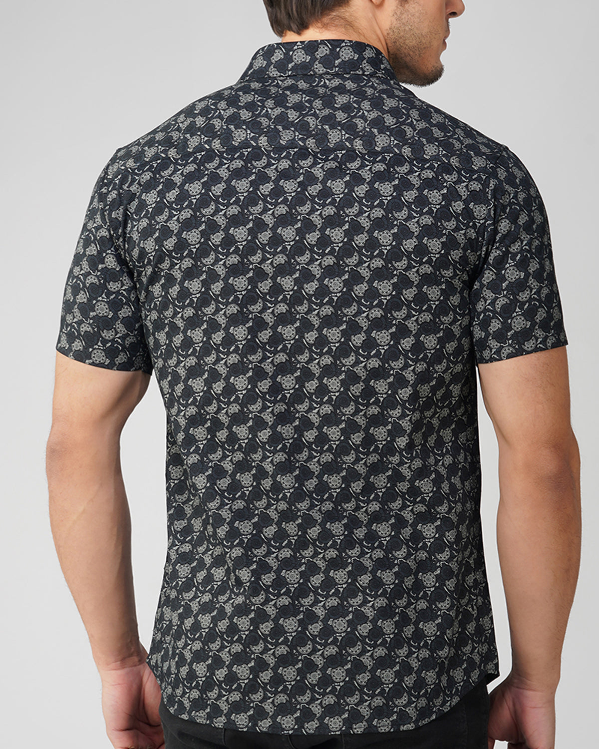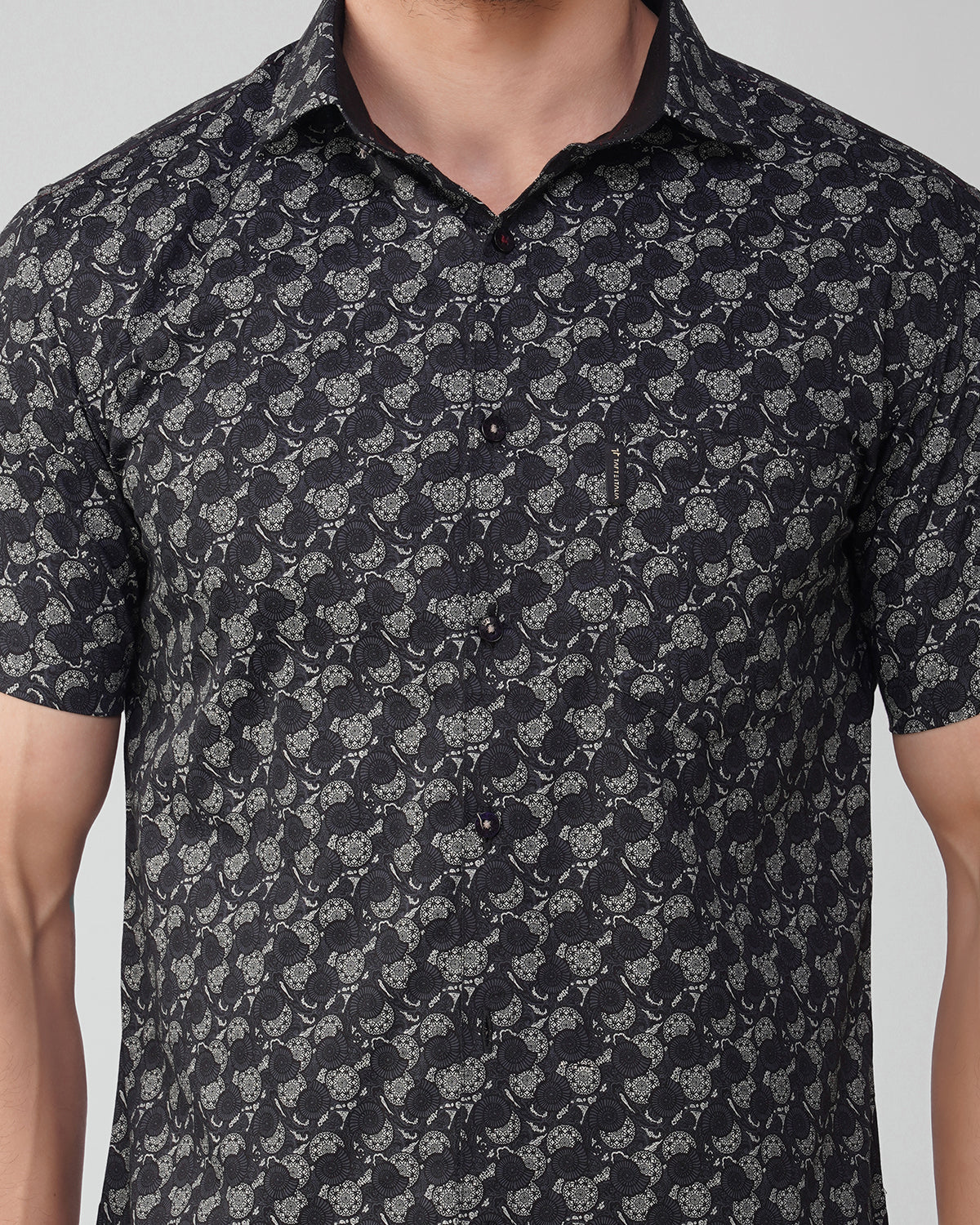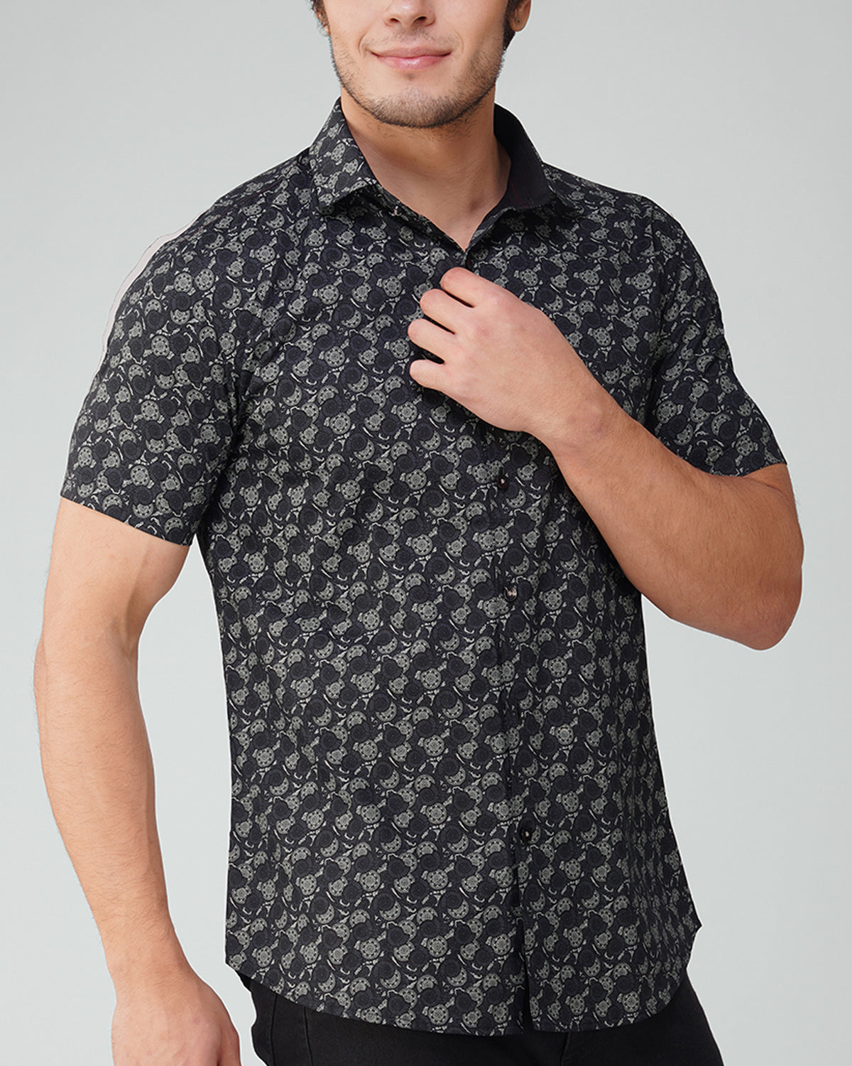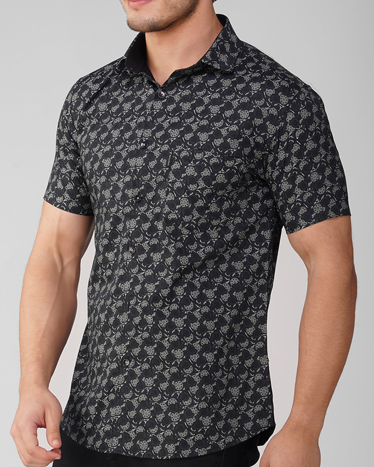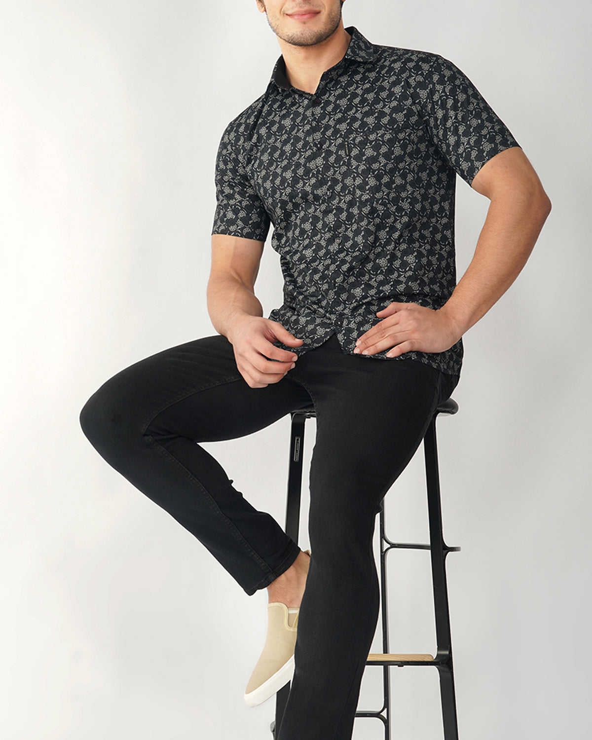 LIT Black Shirt, perfect for your casual essentials with a touch of style featuring a dynamic print, complemented by a regular collar and curved hem. It's the ideal choice for achieving a trendy sundowner look that's sure to turn heads.Material