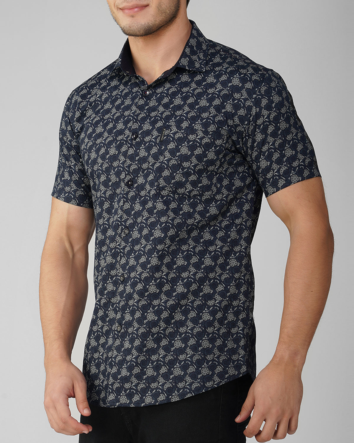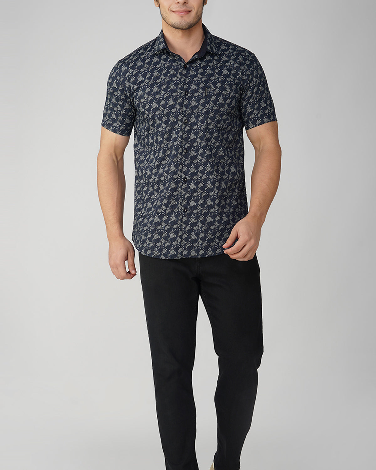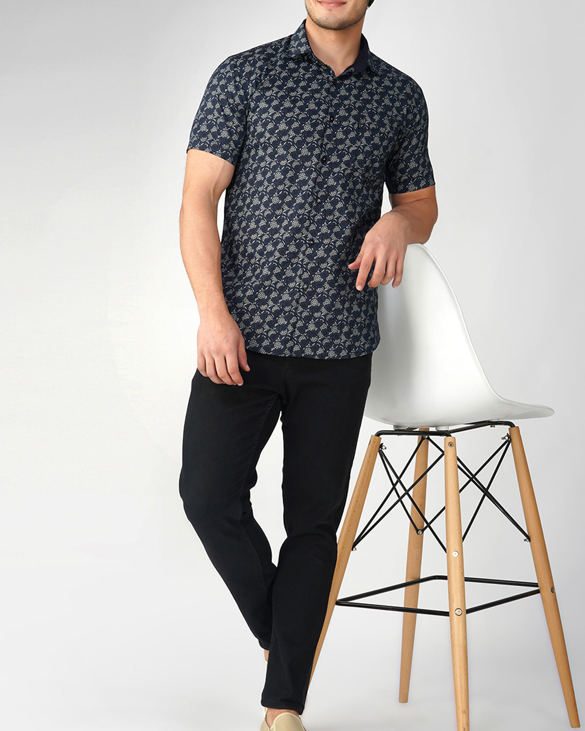 LIT Navy Shirt, perfect for your casual essentials with a touch of style featuring a dynamic print, complemented by a regular collar and curved hem. It's the ideal choice for achieving a trendy sundowner look that's sure to turn heads.Material