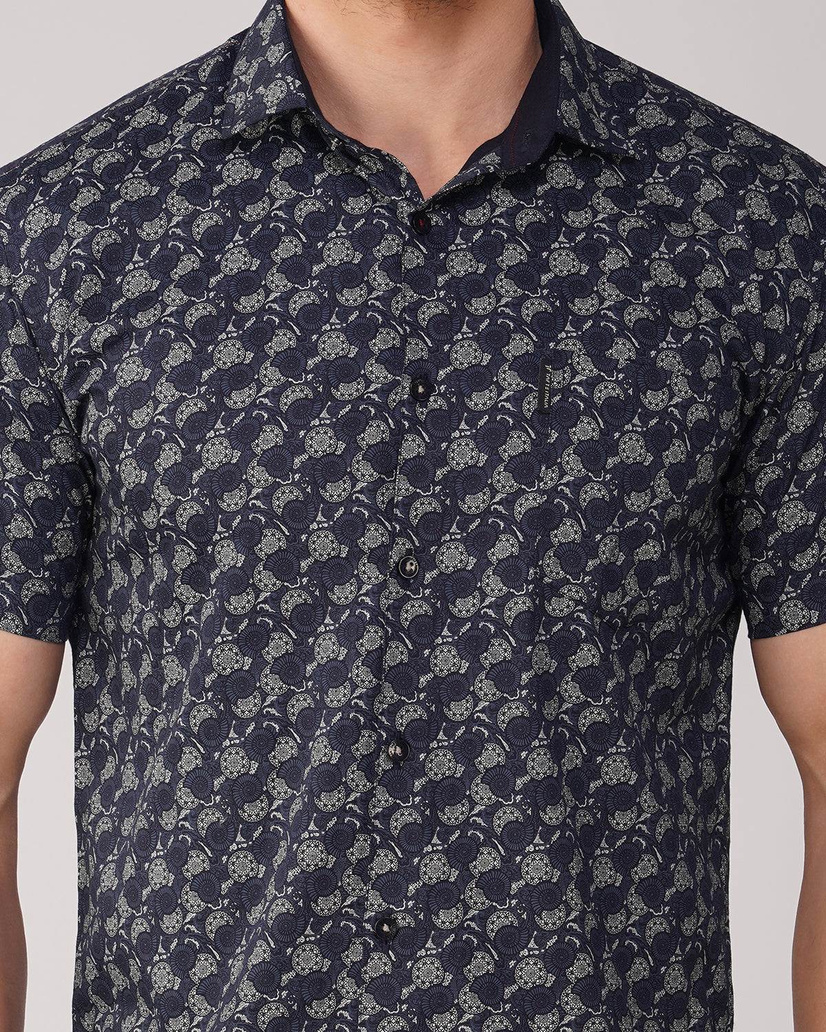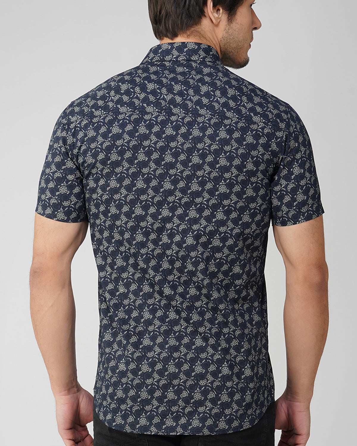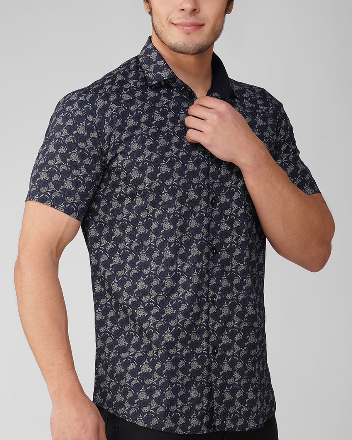 LIT Navy Shirt, perfect for your casual essentials with a touch of style featuring a dynamic print, complemented by a regular collar and curved hem. It's the ideal choice for achieving a trendy sundowner look that's sure to turn heads.Material