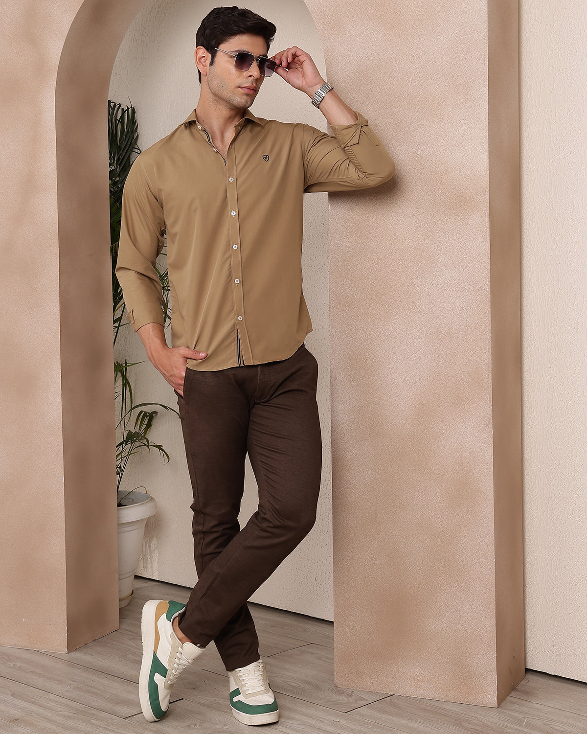 Introducing 'Opus Khaki', where classic meets modern. This full-sleeve shirt blends sophistication with subtle branding and Italian trims for a versatile style. Perfect with chinos or denim, it exudes casual refinementMaterial